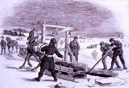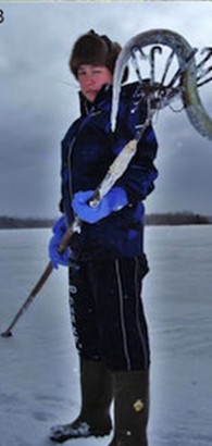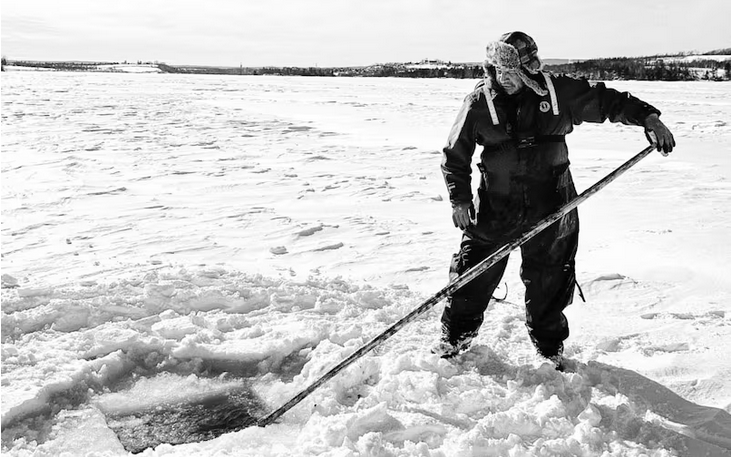 The establishment of a mussel mud business also coincided with the period between 1900 to 1940 and certain community members had devices that collected mussel mud. A mussel mud harvester would sit atop a 6-ft wide hole in the ice of the Miminegash River estuary, with a bucket 18-24 inches deep. Much like a trawling grapple, it sat on the seabed and dredged up the mud under the ice. It was linked to a harness pulled by horse, where block and tackle were above the ice, and the mussel mud would be deposited into sleigh with racks to be sold by the bucket or the yard, stockpiled close to the field, and then spread over fields as agricultural fertilizer. Some areas were dug four meters deep, and a hole remains where those areas were harvested over one hundred years, now infilled with fresh sediment and perfect habitat for American eel.